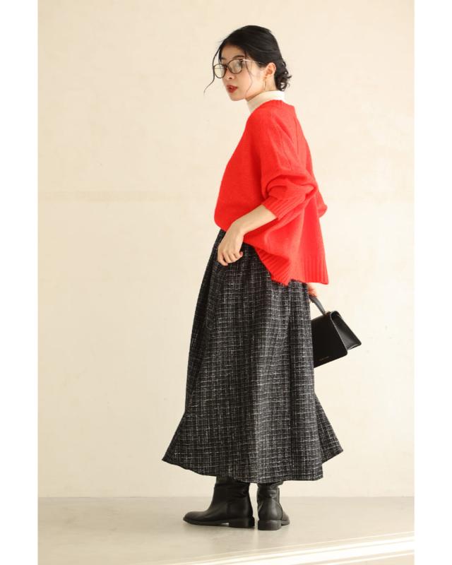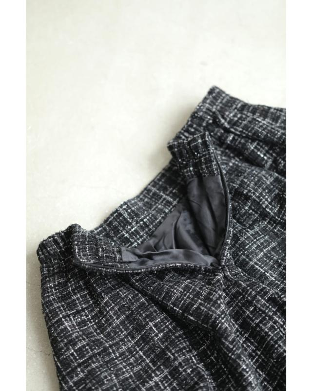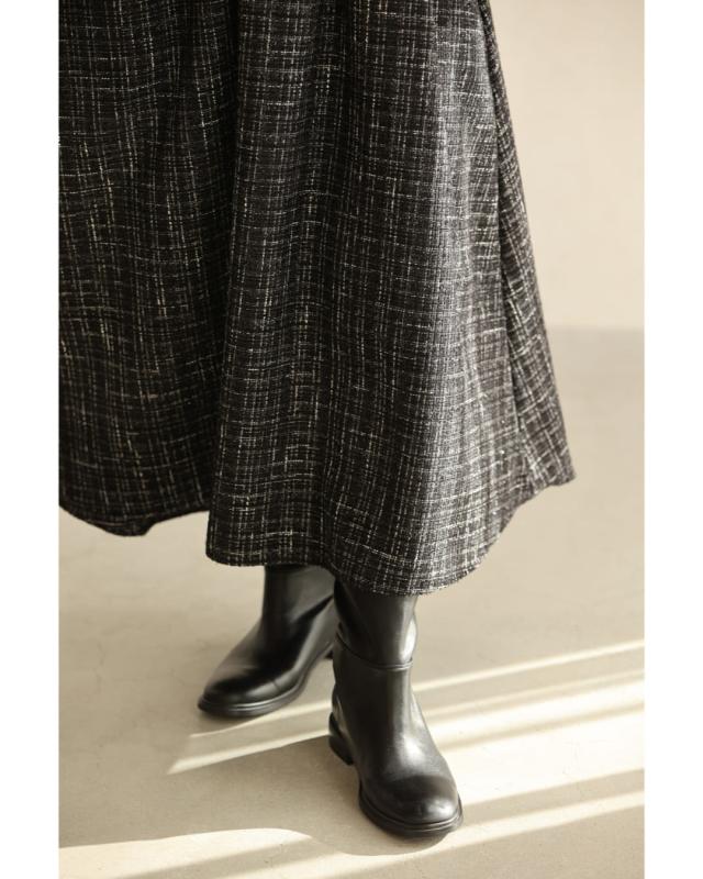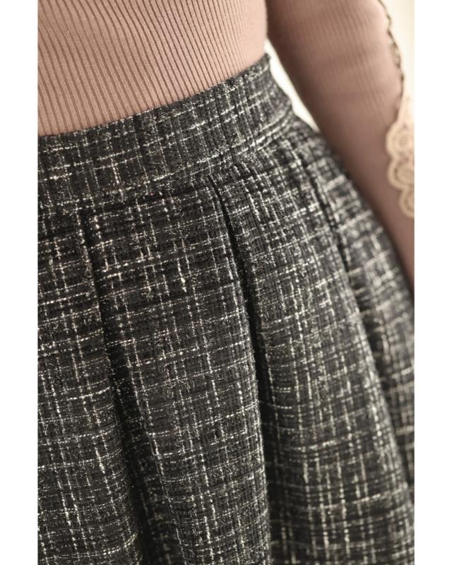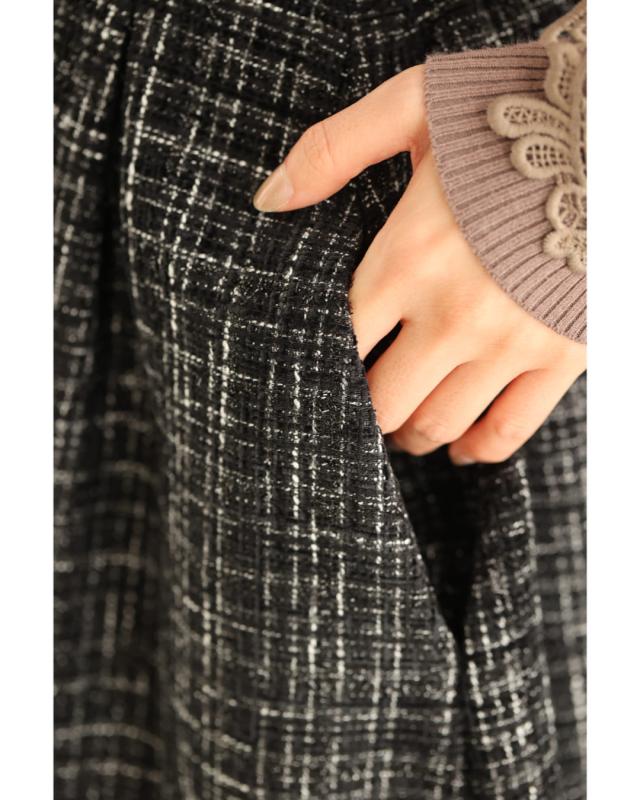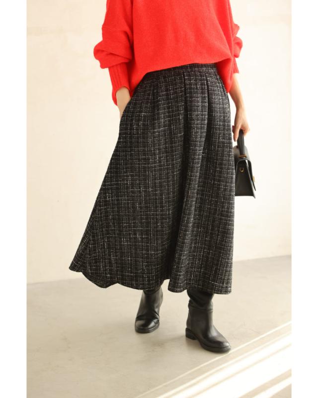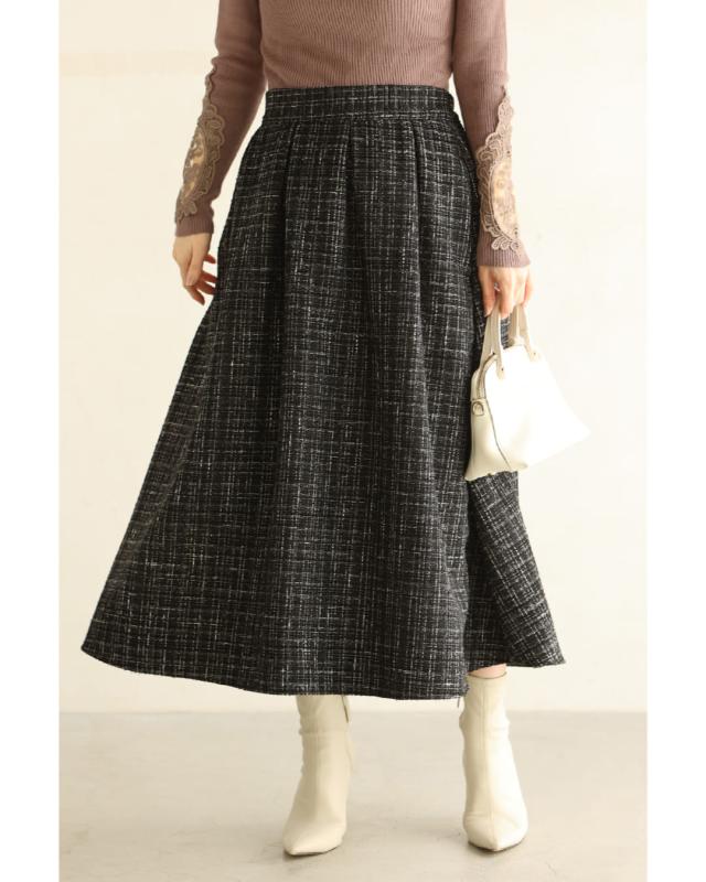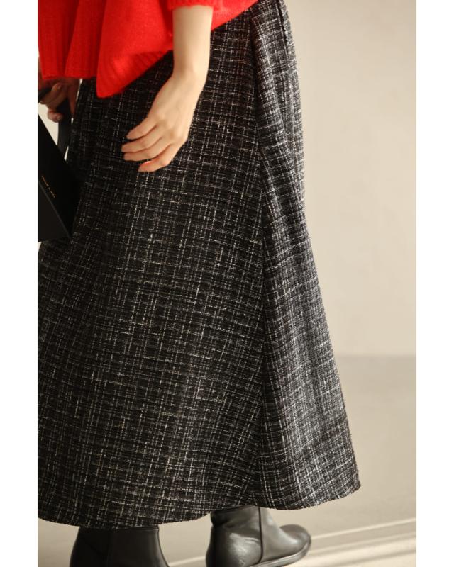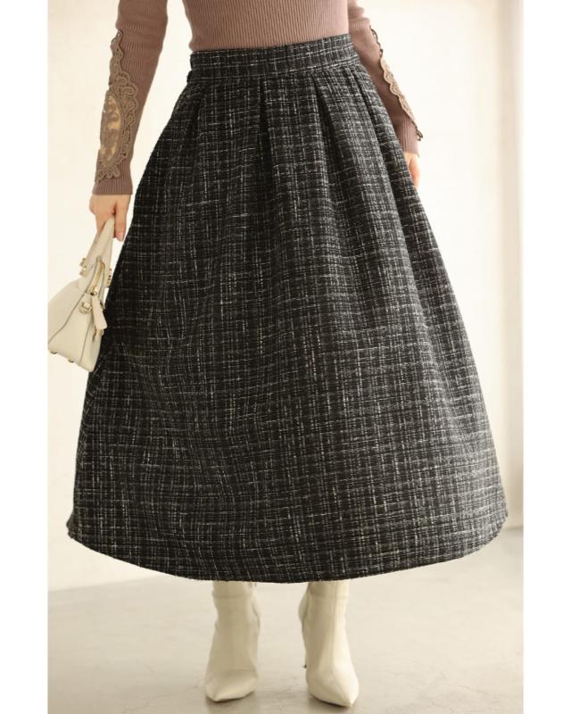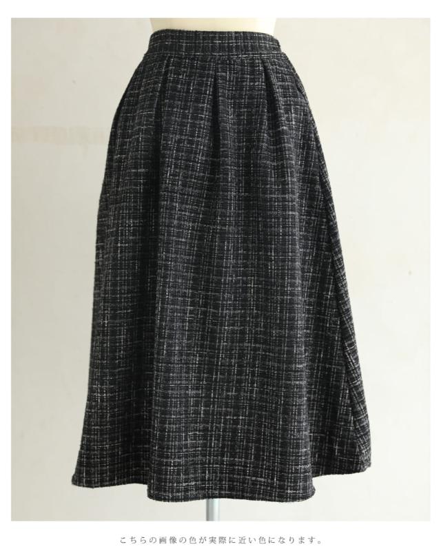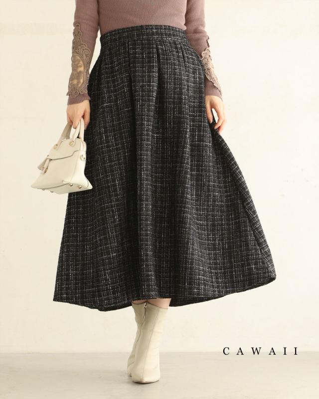 再入荷11月29日 上品なツイードタックミディアムスカート cawaii wkj00127 S~L対応 後ろゴム ファスナー付 チェック柄 ブラック オシャレ 個性的 大人可愛い エレガント 上品 秋服 秋物 冬服 冬物 レディース ファッション ミセス 30代 40代 50代