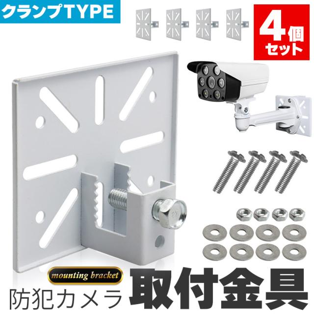 防犯カメラ 取付金具 ブラケット 4個セット クランプ スタンド ハウジング 穴開け不要 挟み込み 監視カメラ ダミーカメラ ソーラーライト 屋内 屋外 設置 鋼鉄 すぐ使える ホワイト カメラ取付ネジ付き ベランダ 扉 板 鉄骨 架台