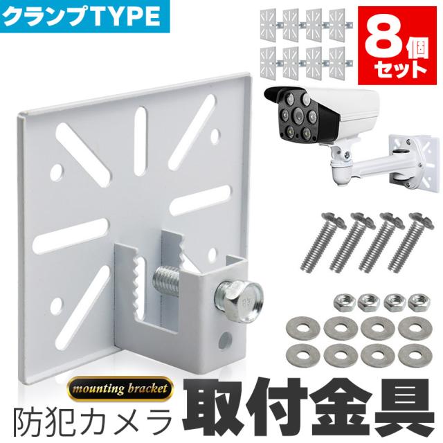 防犯カメラ 取付金具 ブラケット 8個セット クランプ スタンド ハウジング 穴開け不要 挟み込み 監視カメラ ダミーカメラ ソーラーライト 屋内 屋外 設置 鋼鉄 すぐ使える ホワイト カメラ取付ネジ付き ベランダ 扉 板 鉄骨 架台