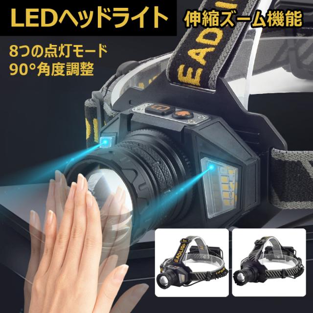 LEDヘッドライト 8つの点灯モード 高輝度 遠近二重光源 防水 90°角度調整 LED電子残量表示 USB充電 伸縮ズーム機能で自由に調整 Type-C充電 航続時間? 夜釣 修理 登山 探検 サイクリング スキー キャンプ アウトドア作業 SOS