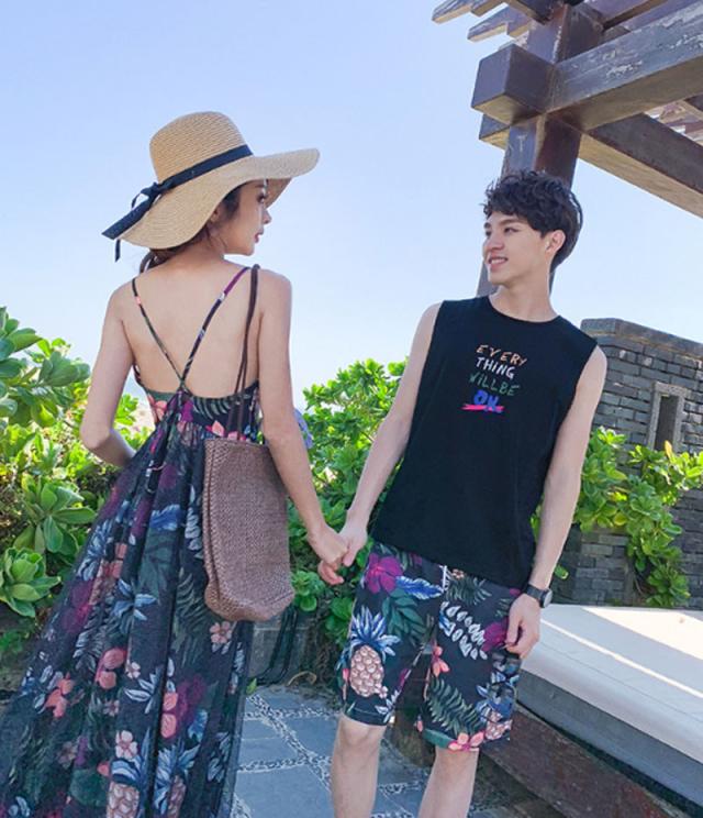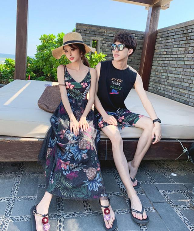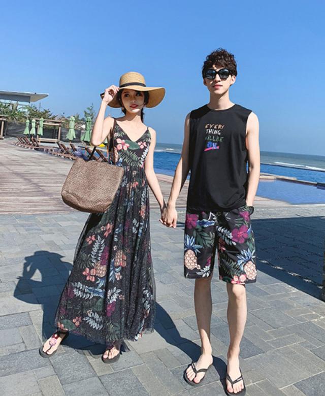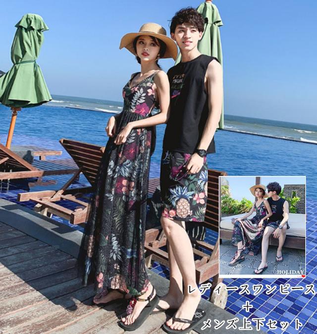【ペア価格】超人気 メンズパンツ レディースシフォンワンピース カップルお揃いカップルペアルック 夏結婚お祝い 旅行 海 花柄 ハネムーンプレゼント お誕生日