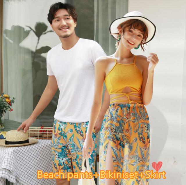 【ペア販売】水着 カップルお揃い ペアルック水着/ ビーチパンツ ビキニ パット付き ノンワイヤー 海水浴 結婚お祝い 花柄