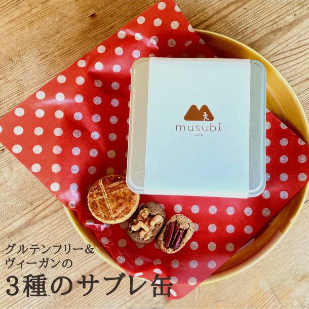 ● musubi cafe 3種の サブレ缶 グルテンフリー クッキー 缶 お菓子 ヴィーガン 詰め合わせ ギフト 小麦不使用 卵不使用 乳不使用 白砂糖不使用 京都 嵐山 送料無料 62014