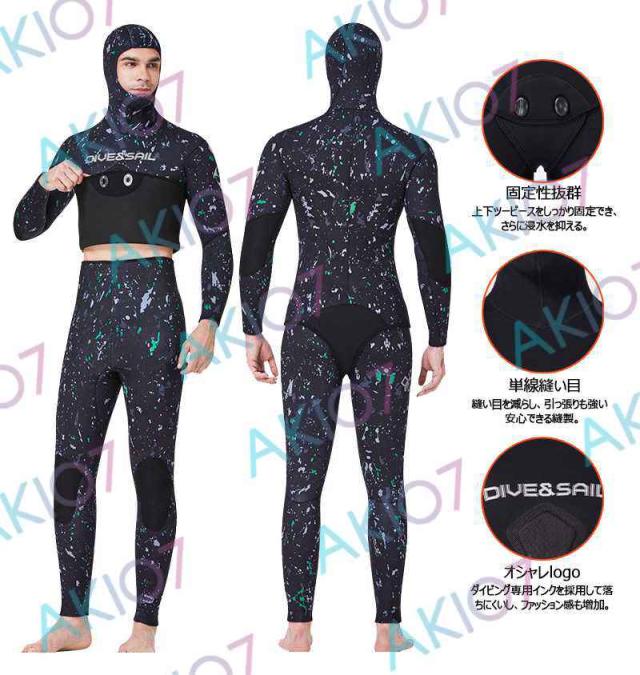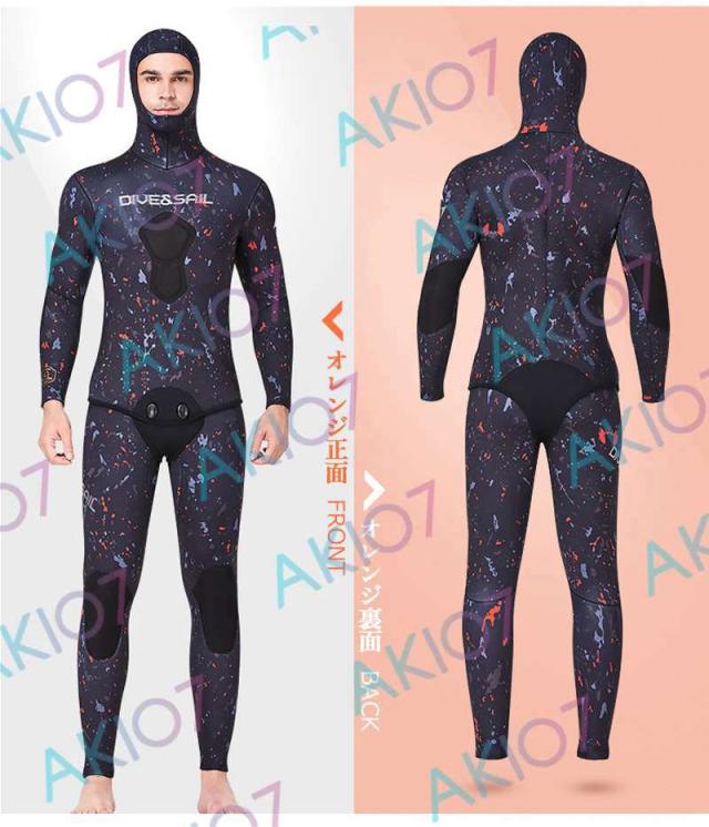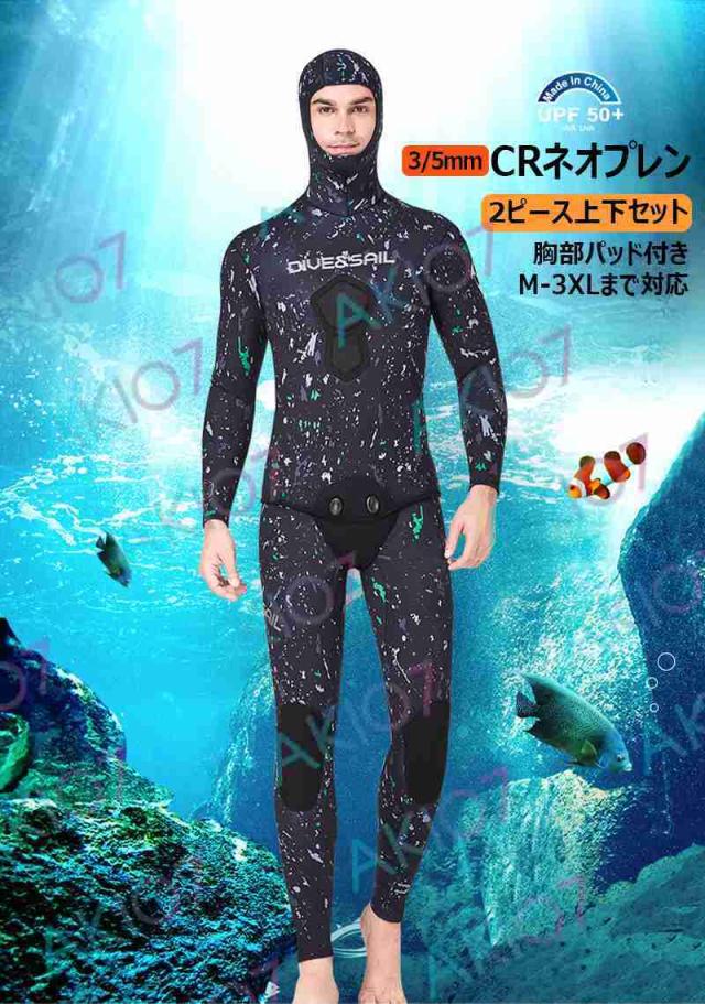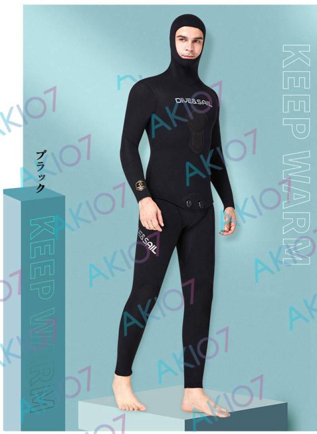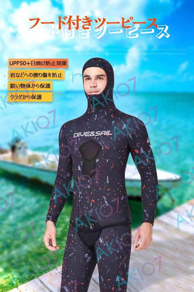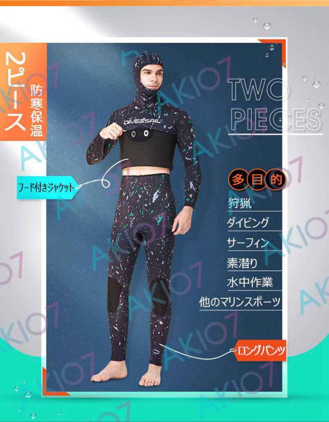 【5mm厚さ&魚突き】 フード付き 2ピース 上着 ロングパンツ 上下セット メンズ ウェットスーツ フルスーツ トライアスロンウェア 素潜り ネオプレン 秋 冬 防寒