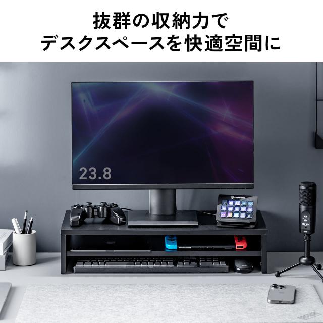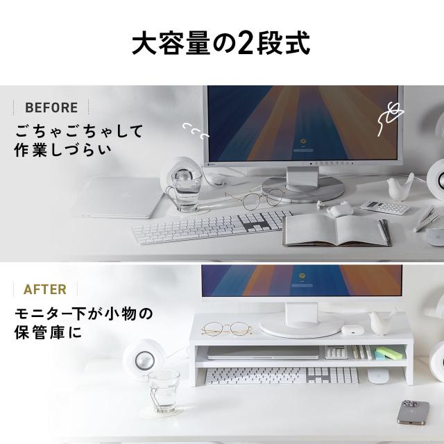 ●キーボードやマウスを収納してデスク上を有効活用できる2段式モニター台です。●中棚付きの2段式タイプなので収納力抜群です。