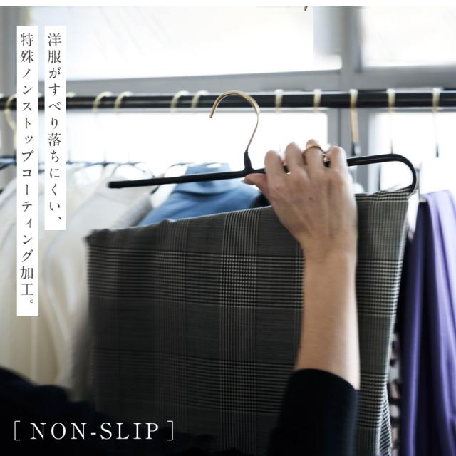 洋服がすべり落ちにくい、特殊ノンストップコーティング加工。滑り落ちやすいパンツの収納も安心。
