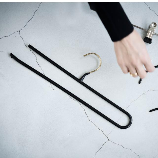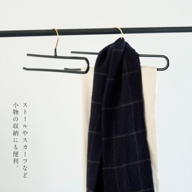 「ボトムハンガー ダブルバータイプ」は、ハンガーラックの下に引き出しなどの収納がある場合や、空間を広く見せたい方のために「すっきり収納できる。」をコンセプトに制作しました。ボトムのみならず、ストールやスカーフなど小物の収納にも便利です。また、ボトムを折りたたんで差し込むだけという使い勝手の良さもこのハンガーのメリットです。