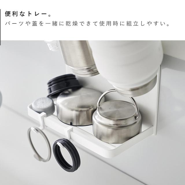マグネットで簡単に取り付けることができるトレー付きのボトルホルダー。ホルダーにはマグボトルやペットボトル、哺乳瓶など、トレーにはパーツや蓋を一緒に干すことができるので使用時に組立がしやすく楽ちん。