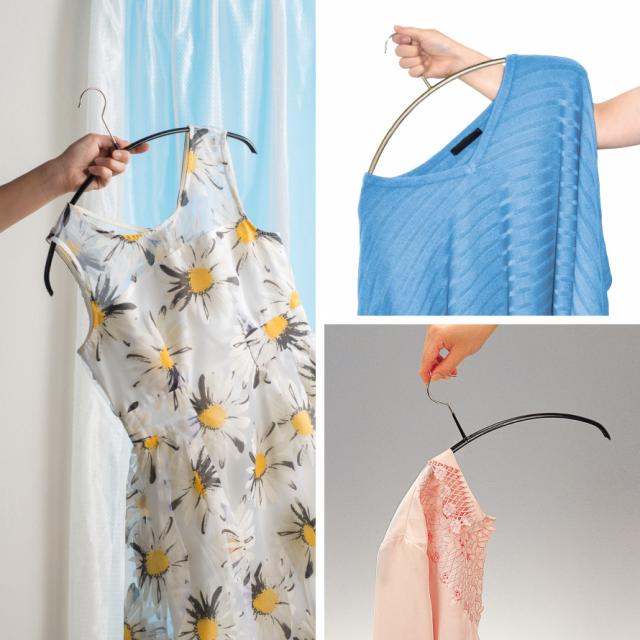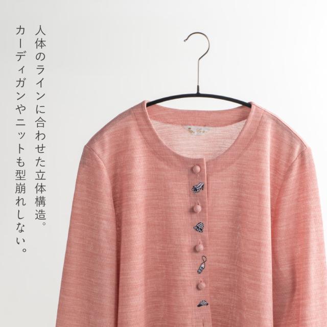 洋服がすべり落ちにくい、特殊ノンストップコーティング加工。人体のラインに合わせた立体構造で、滑り落ちやすいカーディガンやニットも型崩れなく収納可能。キャミソールやワンピースもしっかりかけることができます。