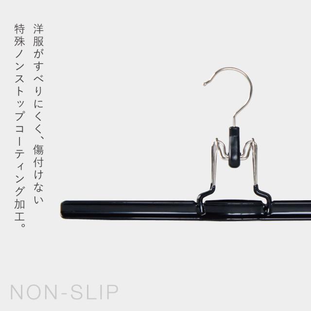 表面は、洋服がすべり落ちにくい特殊ノンストップコーティング加工。柔らかい材質なので衣類に優しく、傷つけずに安心。しっかりと挟むのでズリ落ちを防ぎます。