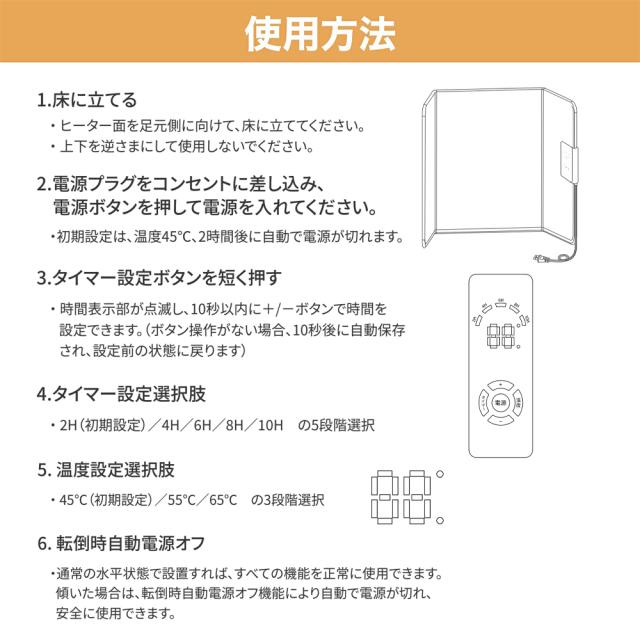 オフタイマー設定:2時間(初期設定)、4時間、6時間、8時間、10時間で自動電源オフ