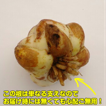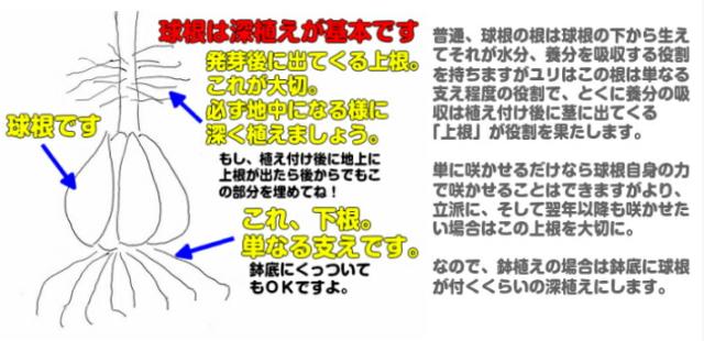 場合が多いです。 でも、ご安心を。 ユリの球根の 下から生える根はただの支えみたいな物。 養分、水分を吸収するほんとうの 「根」は実は発芽して球根の上の部分の茎から生えてくる「上根」なんです。 なので、ユリの球根を植えるときは、発芽してから、その茎に生える根が土 の中にキチンと埋まることを考えて「深植え」します。 |