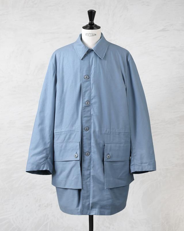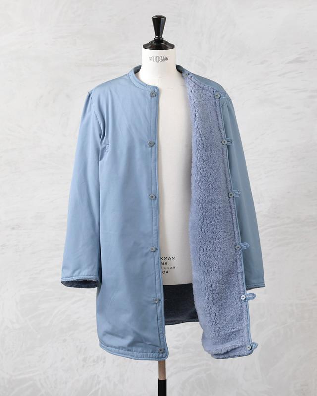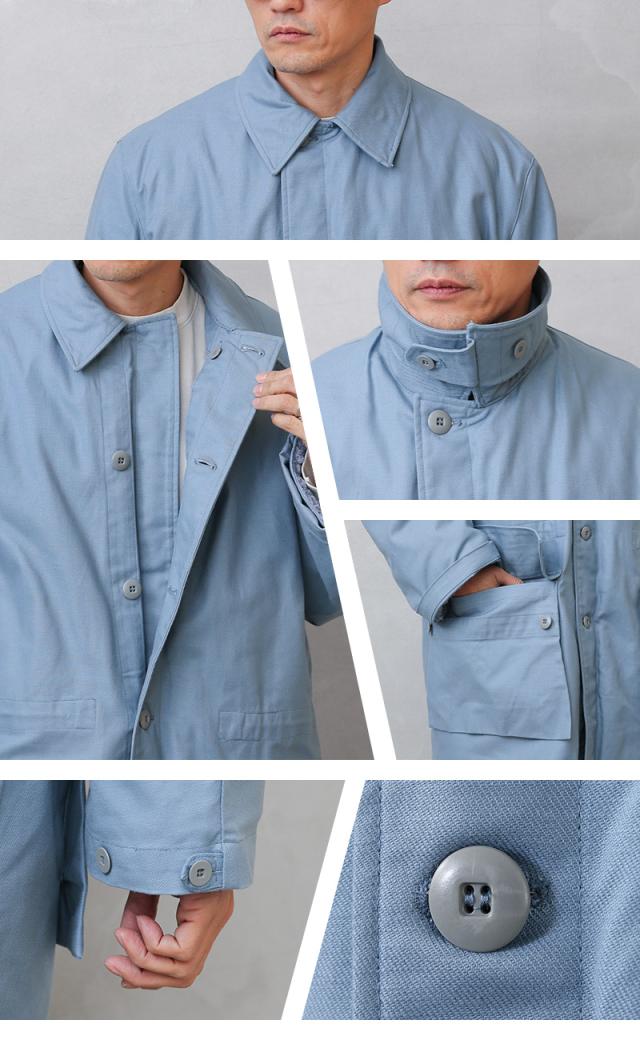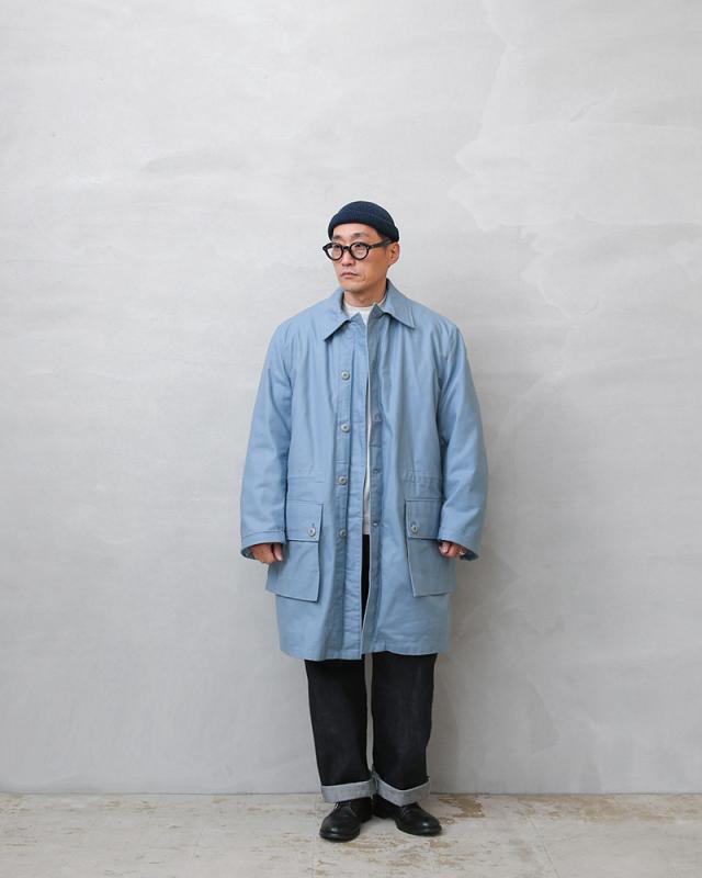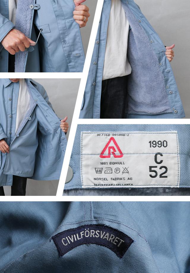 スウェーデンにおける防衛の一翼を担っていた民間防衛(CivilforsvarまたはCivilforsvaret)で使用されていたフィールドコート。 厚手のコットン素材で、しっかりと温かさを感じられるボアライナーとのセットになっています。サイドに二か所大き目のフラップポケット、ドローコードで絞ることができるウエスト、襟元のチンストラップなど、1960年〜1980年代にかけて軍で採用されていたM-59のデザインはそのままに、民間向けにカラーリングをライトブルーに変更したアイテム。ざっくりとしたシルエットも美しく、襟を立てることでより防寒性も高まりどこかハンティングジャケットのような優雅な雰囲気も感じられます。ボアライナーはボタンで閉じることが出来るので単体での着用も可能です。