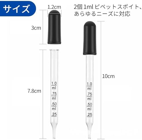 スポイト最小分割目盛: 0.25ml;スポイト容量:1ml;スポイト直径:9mm;スポイト長さ:77mm;材質:ガラス、ゴム;色:透明。
