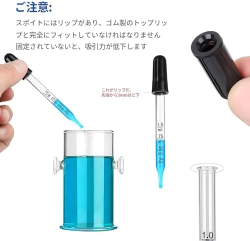 【商品仕様】 スポイト最小分割目盛: 0.25ml;スポイト容量:1ml;スポイト直径:9mm;スポイト長さ:77mm;材質:ガラス、ゴム;色:透明。プラスチックチューブ包装。