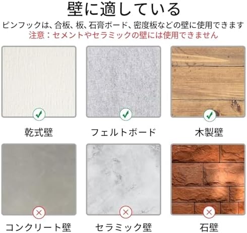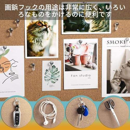 【説明】画鋲フックの用途は非常に広く、いろいろなものをかけるのに便利です。たとえば、写真立て、カレンダー、鍵、ハサミ、台所道具などです。自宅やオフィス,キッチン,玄関,学習室などに幅広く活用できます。ピンフックは、合板、板、石膏ボード、密度板などの壁に使用できます。 注意:セメントやセラミックの壁には使用できません。