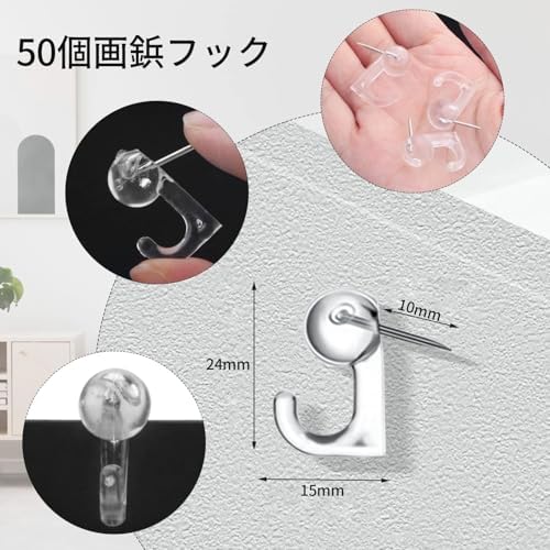【安定性抜群】耐荷重約1kg。押しピンフックのピンが斜めに刺すように設計されているので、工具なしで簡単に刺せてガッチリ固定できます。1箱に50個入っているので、長く使えます。
