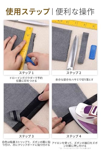 【折り込み方】 衣類を置いた後、長さを測り、アイロンが折れるラインを折る。長さを測ります。カットテープを水に浸して絞る。接着面(白い線)が下になるように下生地を置き、アイロンをかけます。(重力を利用してアイロンをかけてもよい)。 アイロンの所要時間は約10秒です。