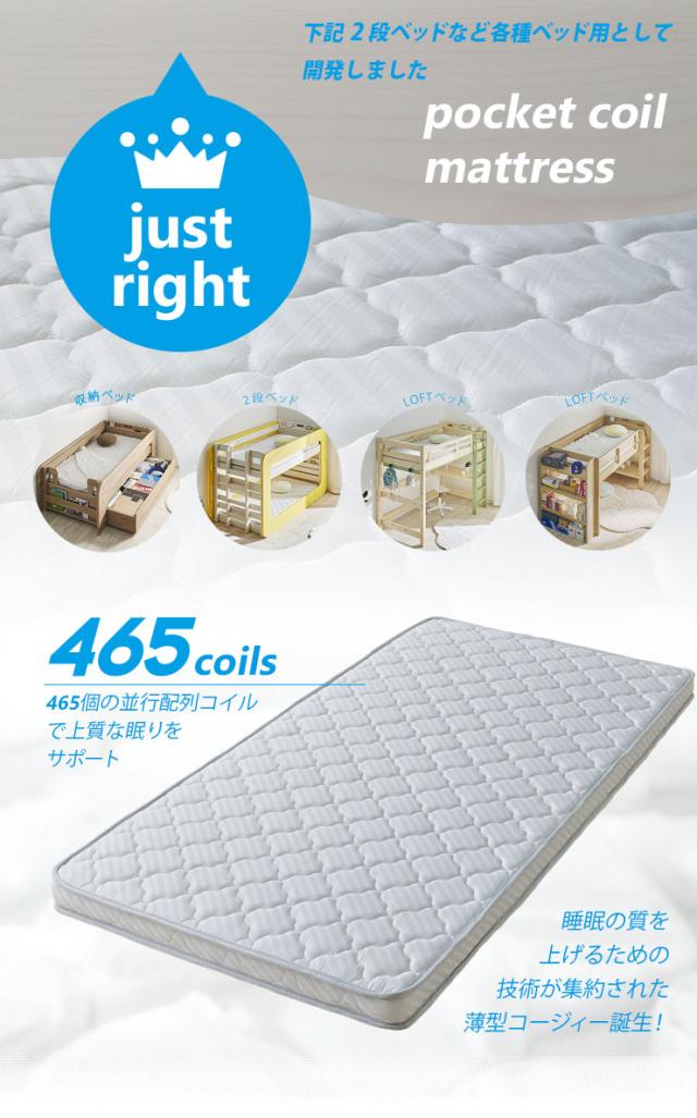 中材:圧縮ポリファイバー、ポケットコイル(60mm高/2mm線径/4巻き)