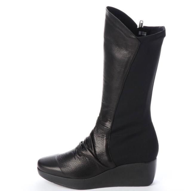 柔らかく足馴染みの良い牛革とストレッチ素材コンビのコンフォートロングブーツ。