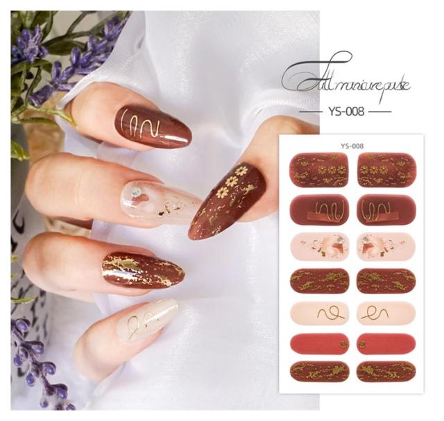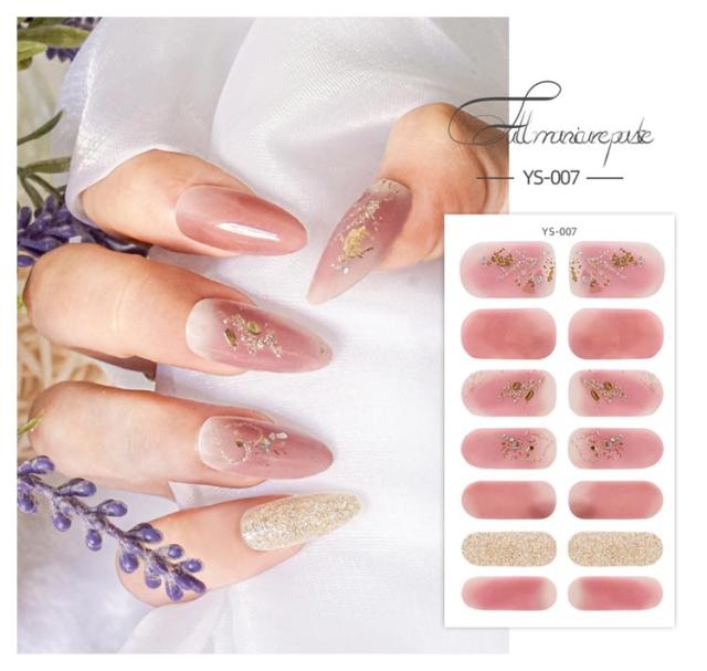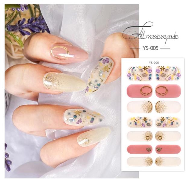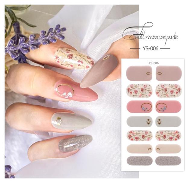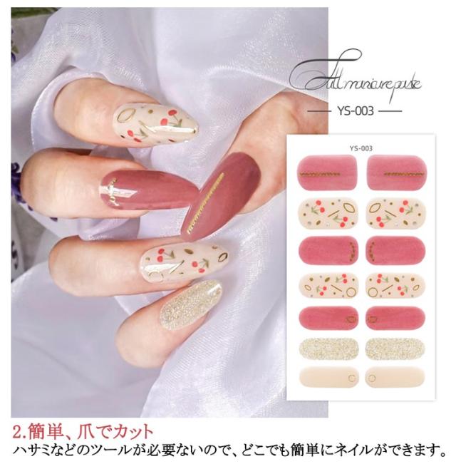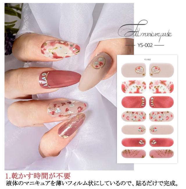 | サイズについての説明 | 14シート入り(196枚セット) 【ご使用前に】 ●爪に油分や水分、汚れが付着しているとが剥がれやすくなりますので、爪の表面をキレイに拭き取ってください。 ●甘皮を処理し、付属のファイルなどで爪の形や表面を整えるとよりキレイに仕上がります。 ●シートからネイルを剥がす際にはシートの外側部分を持って剥がしてください。 (1)製品を爪に合わせ、爪よりも少し小さめのネイルをお選びください。 (2)キューティクルラインと1mmほどの余裕があるところにネイルを貼ってください。 (3)ネイルを貼って余りのは爪の形に合わせて折ってください。 ファイルを利用して、爪の下の方向に向けて余りのネイルを削ってください。 (4)お好みの硬化方法を選んでください。 ・寝る前に貼り硬化する場合 ・自然光で硬化する場合:約2時間(自然光が多い室内と室外にて) ・UV&LEDライトで硬化する場合:約30秒 【剥がし方】 ●ウッドスティックでキューティクルラインからゆっくり押出しながら剥がしてください。 ※剥がしにくい場合はお手持ちのハンドクリーム等を塗ると効果的です。 ・UV&LEDライトで硬化すると自然光で硬化するよりも剥がしづらい可能性があります。 |