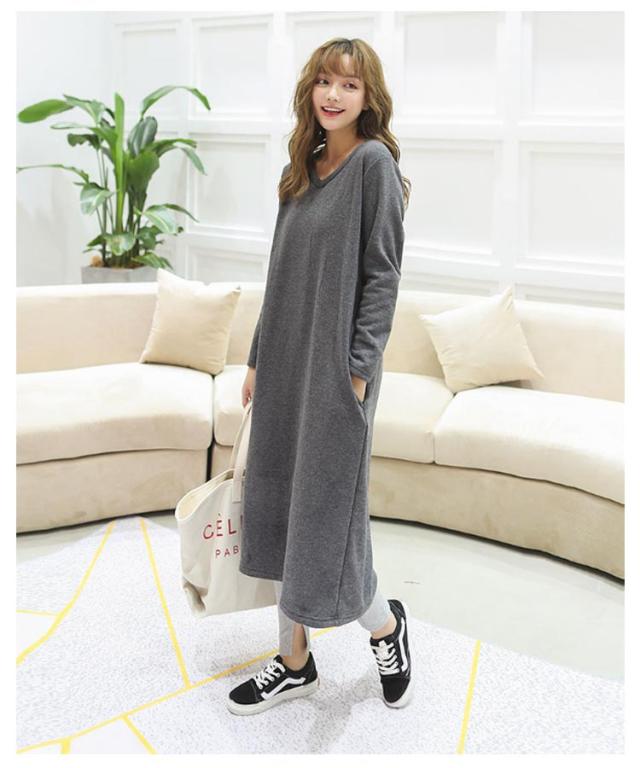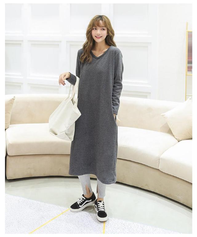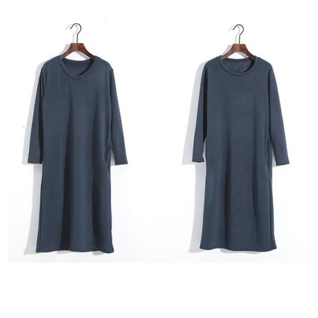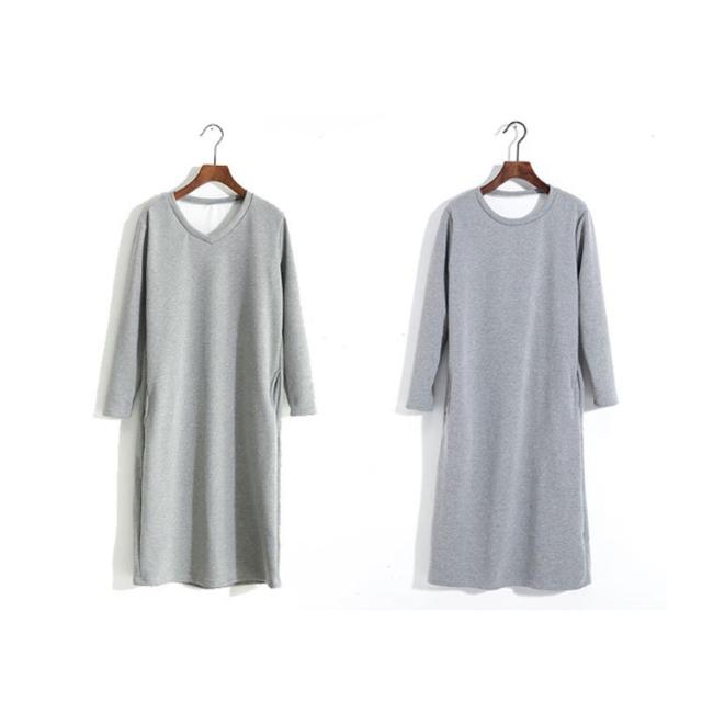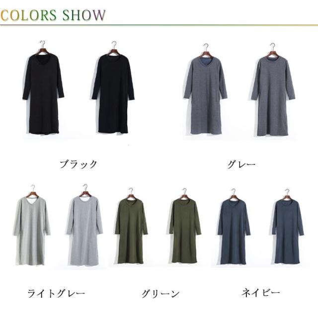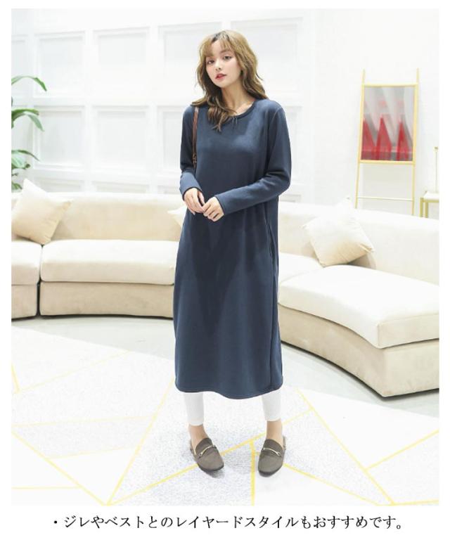 防寒 スウェット 暖かい トレーナー ワンピース あったか ワンピース 保温 丸首 クルーネック Vネック 長袖 ポケットあり ロング丈 ひざ下 シンプル