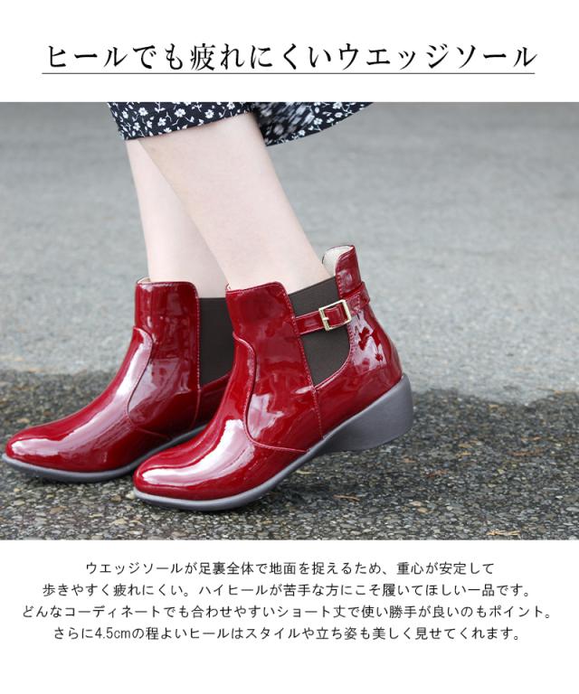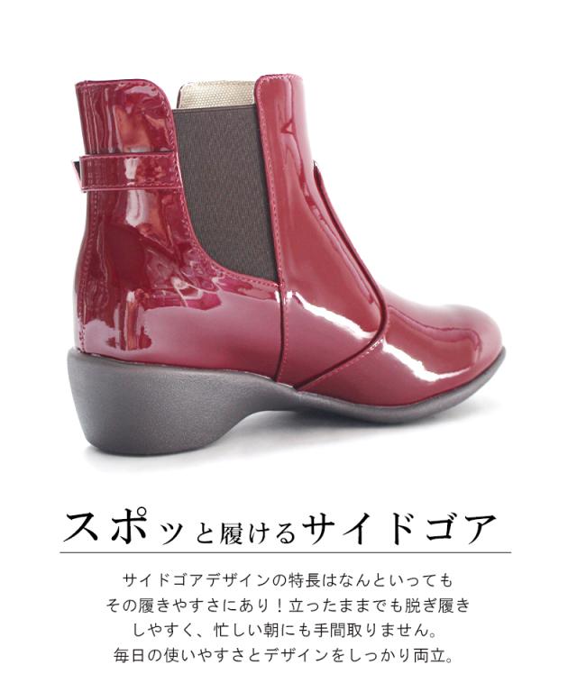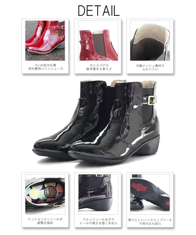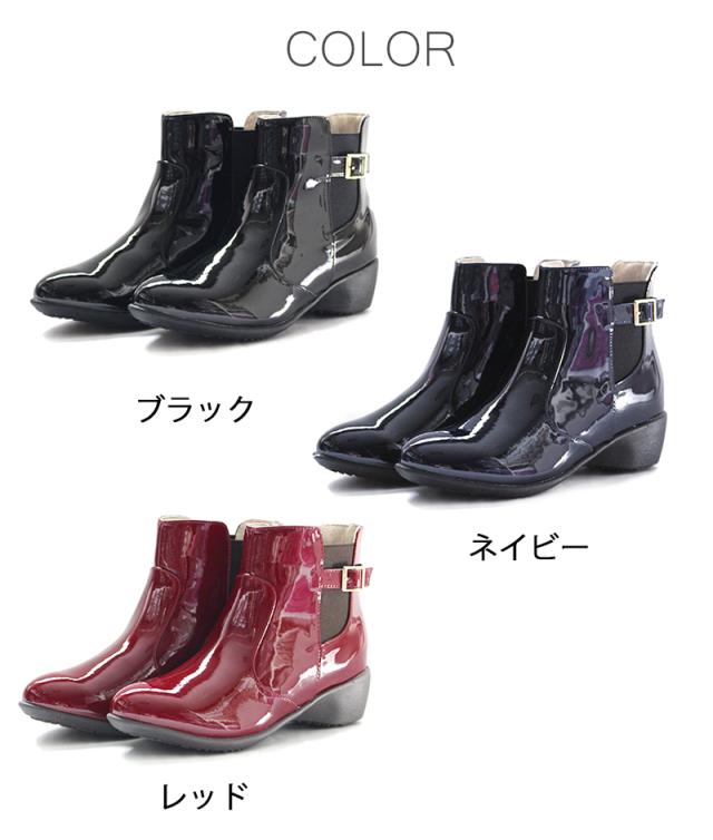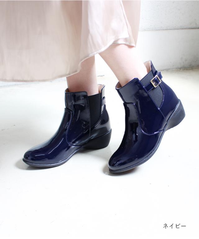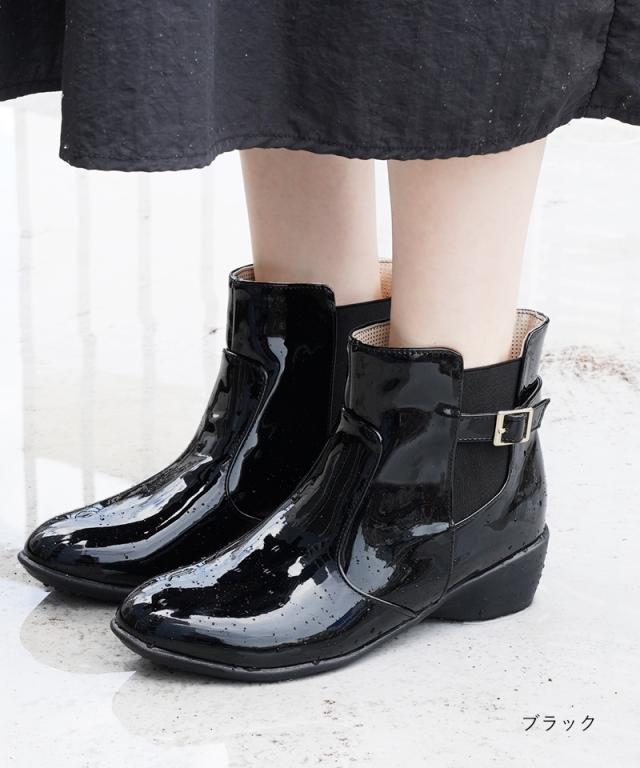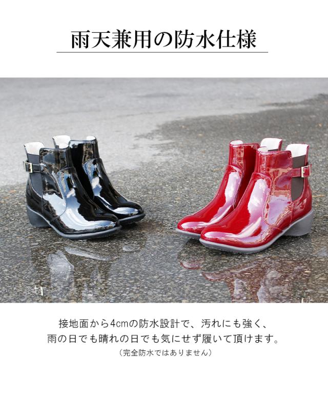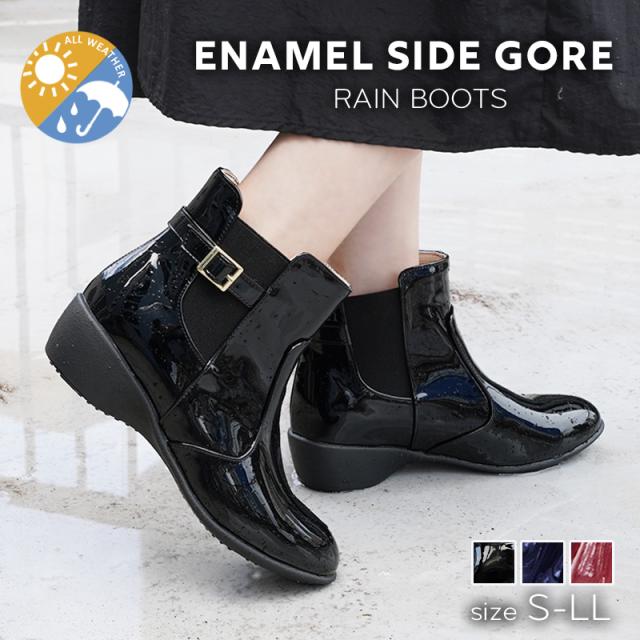ブーツ エナメルサイドゴア レインブーツ レディース ショート 4cm ヒール サイドゴア 防水 雨天兼用 エナメル 歩きやすい 履きやすい 楽ちん シンプル 美脚 スタイルアップ ウエッジソール 定番 黒 ブラック 軽量 S〜LL