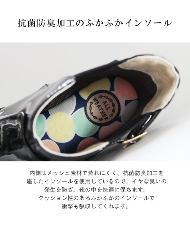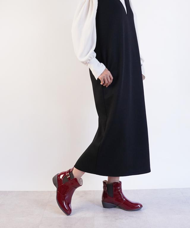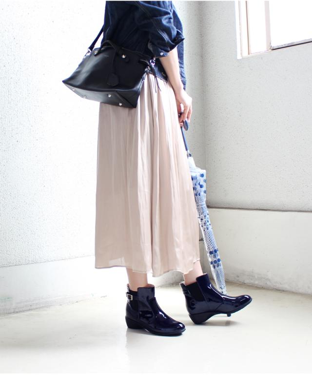 ■金具付きのベルトラインが大人っぽいエナメルサイドゴアレインブーツ。スタイリッシュで細身のシルエットが女性らしく華奢な印象に。