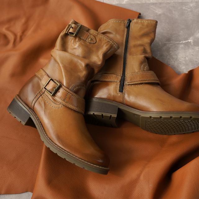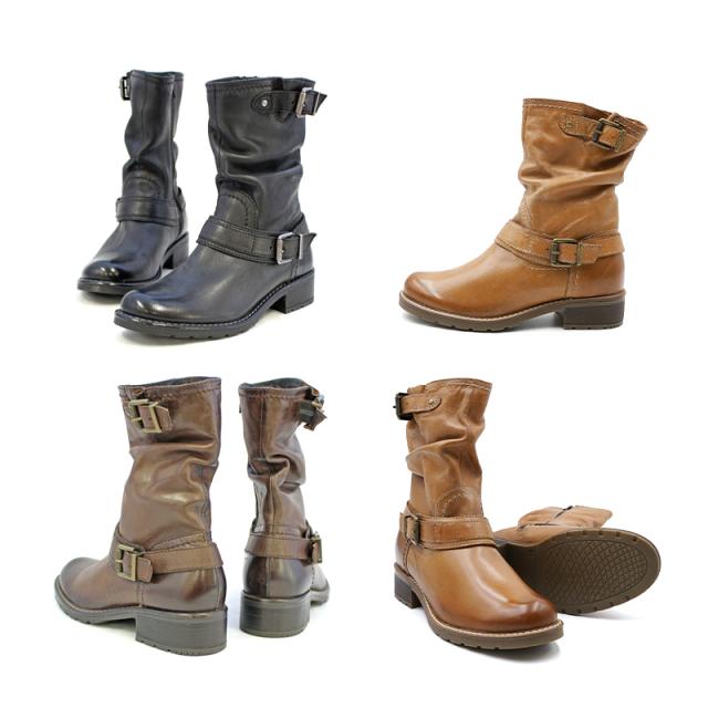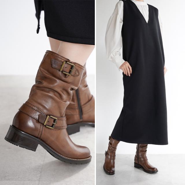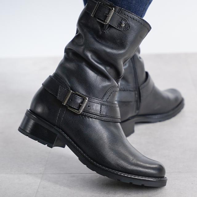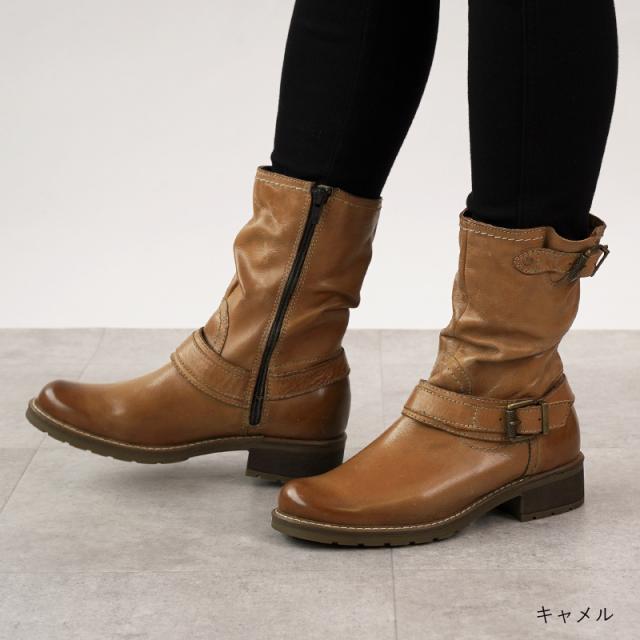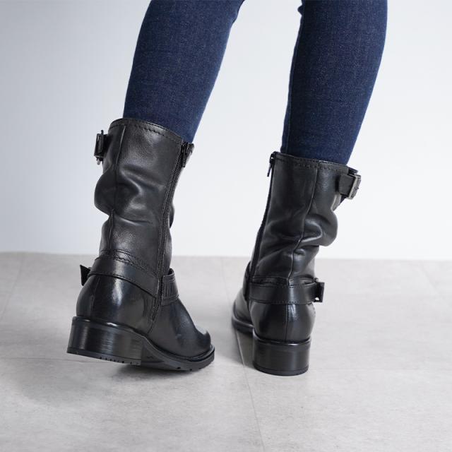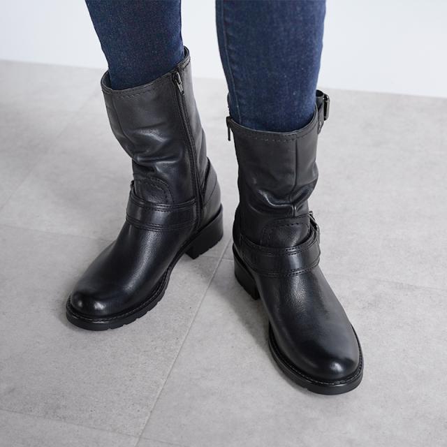 ミドル丈本革エンジニアブーツ 3.7cmヒール 革 エンジニアブーツ レディース 靴 22.5cm〜24.5cm サイドファスナー ジップ レザー 本革 ローヒール 牛革 シューズ ブーツ ミドル丈 ハーフ丈 秋冬 あたたか 内側フリース