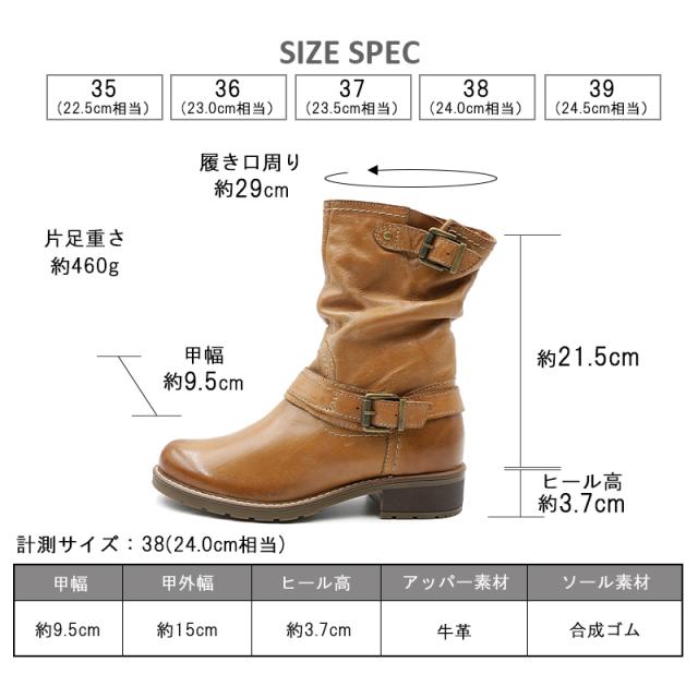 ヒール高:3.7cm / 甲幅:約9.5cm / 甲外幅:約15.0cm /筒高:21.5cm / 履口周り:約29cm/ 片足重さ:約460g/ 素材:牛革