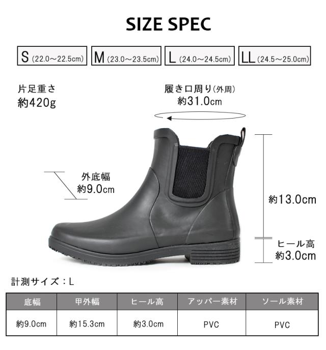 ヒール高:約3cm / 底幅:約9cm/ 甲外周り:約15.3cm / 素材:PVC/ 片足重さ:約420g