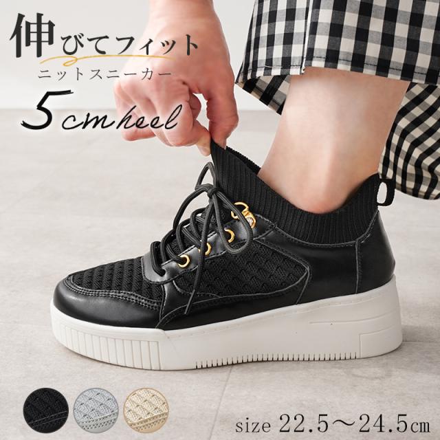 スニーカー レディース 厚底 きれいめ ニット 5cmヒール ウォーキングシューズ おしゃれ かわいい 人気 美脚 身長アップ ブラック グレー ベージュ 22.5〜24.5cm 歩きやすい 痛くない