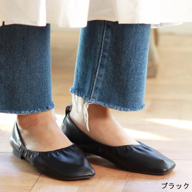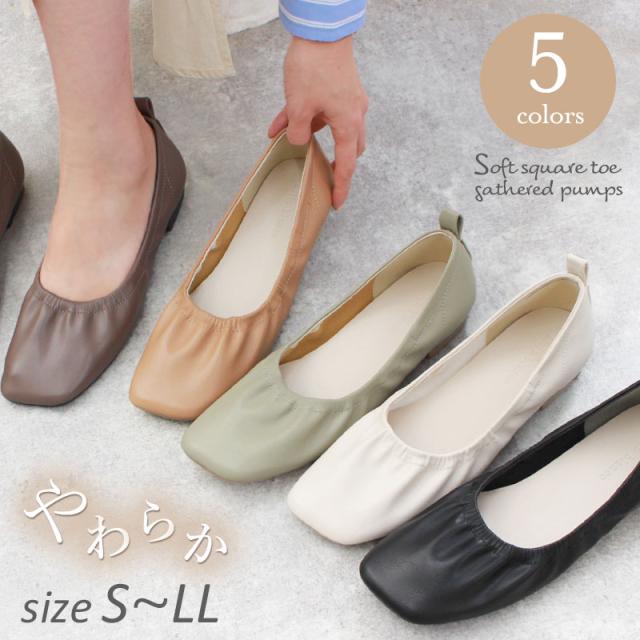 パンプス フラットシューズ レディース 軽量 ぺたんこ スクエアトゥ ローヒール 2023SS 新作 ソフトギャザー 歩きやすい フラット ブラック 黒 おしゃれ 柔らかい 通勤 お出かけ 楽 疲れない 痛くない クッション S M L LL フィット