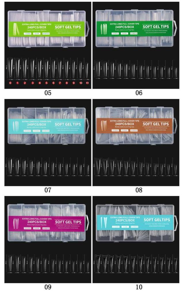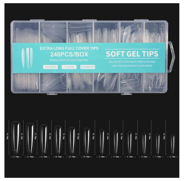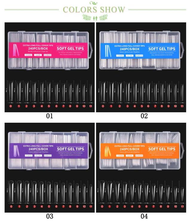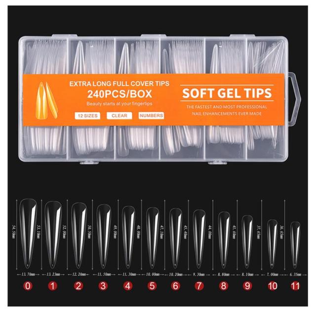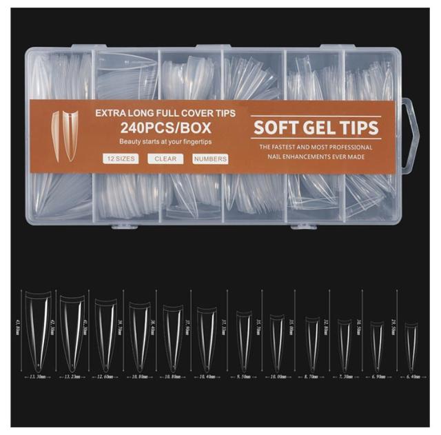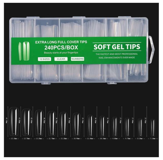| ロングタイプ!12サイズ240枚入り! ネイルチップ スーパーロング 12サイズ 240pcs 長くて美しいネイルを楽しめるスーパーロングタイプ。 形状はオーバル、ポイント、バレリーナ、スクエアオフ、スクエアからお選びいただけます。 | |