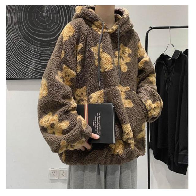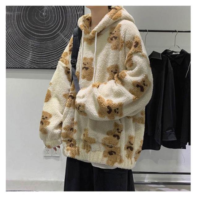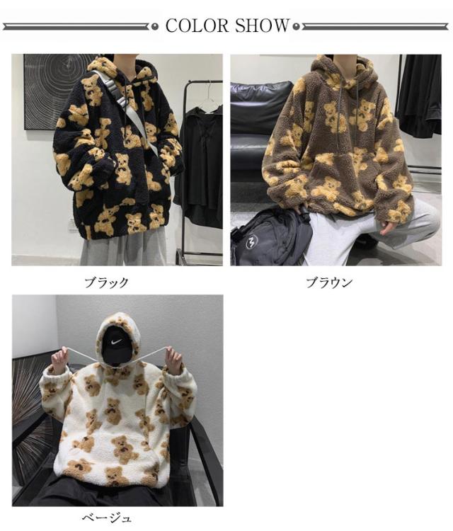 ボア パーカー メンズ プルオーバーパーカー レディース くま柄 部屋着 ボア オーバーサイズ トップス ゆったり 暖かい ボアフリース 長袖 パーカー 秋冬 大きめ 防寒 あったか もこもこ 可愛い おしゃれ