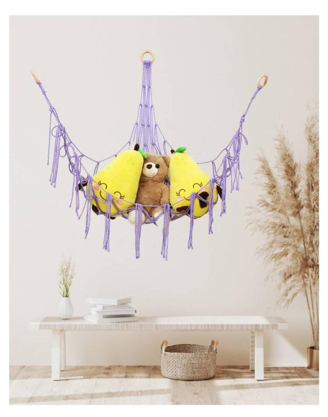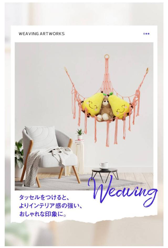 | お子様の大切なぬいぐるみをしっかりと収納できるハンモック 三角形のデザインはコーナー位置を最大限に活用して、ぬいぐるみも一目で見つけられます。 おしゃれなデザインは、どんなインテリアにもマッチします。 タッセルをつけると、よりインテリア感の強い、おしゃれな印象に。 子供部屋だけでなく、リビングや寝室など、さまざまな場所に設置できます。 | |