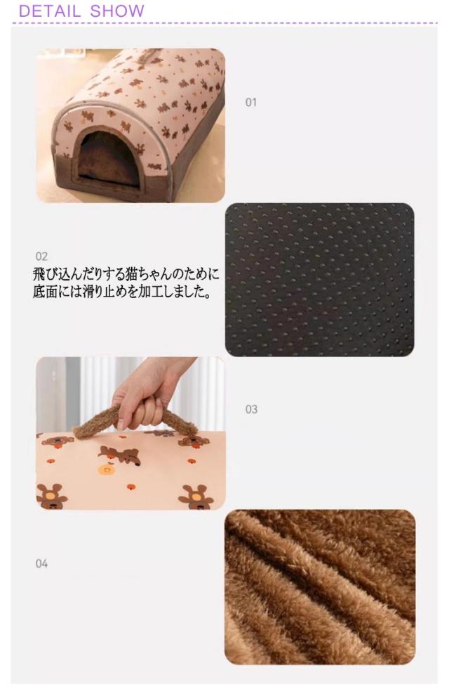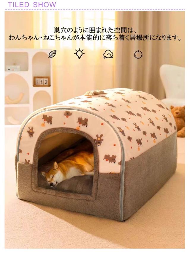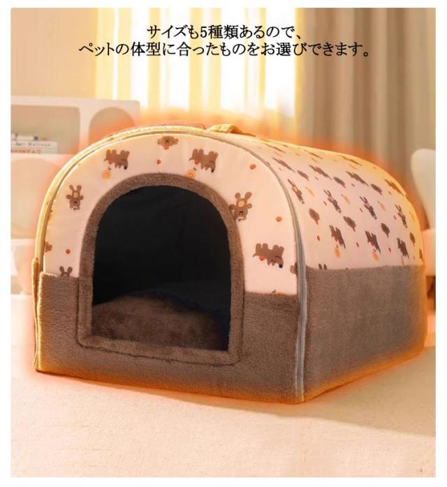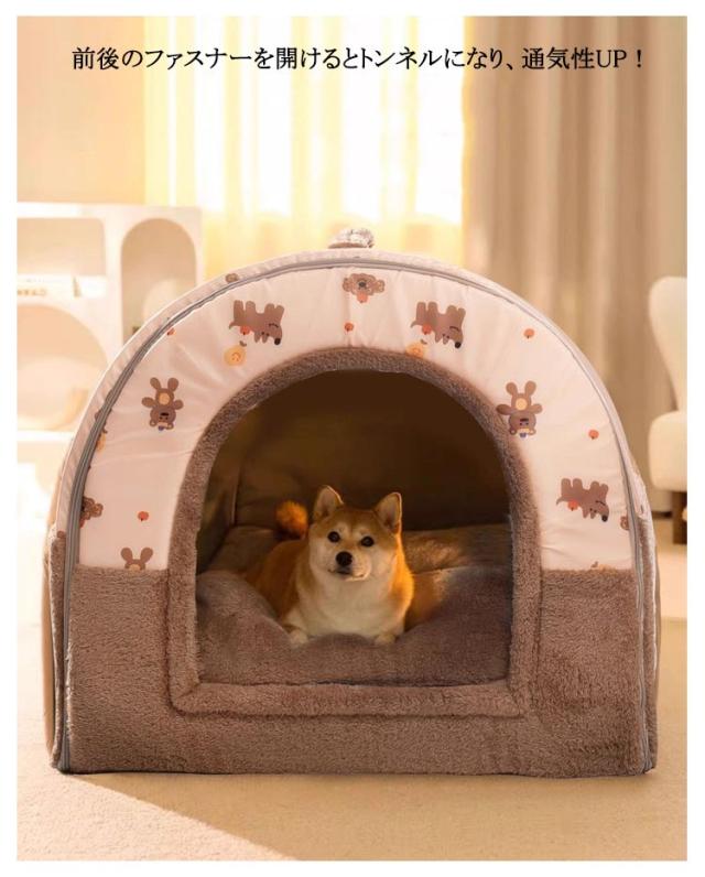 | 隅っこが好きな猫ちゃん、ワンちゃんも大喜び!隠れるのが好きなワンちゃん、猫ちゃんにおすすめのドーム型ハウス。 巣穴のように囲まれた空間は、わんちゃん・ねこちゃんが本能的に落ち着く居場所になります。 天井を押し込むとペットベッドに変身!季節や場所に応じて、2つの使い方ができます。 前後のファスナーを開けるとトンネルになり、通気性UP! 飛び込んだりする猫ちゃんのために底面には滑り止めを加工しました。 ボア生地とフランネル生地を使用しており、優しい手触りで暖かく過ごすことができます。 ぬくぬくとあったかい空間なので寒い時期のお留守番やお昼寝も安心です。サイズも5種類あるので、ペットの体型に合ったものをお選びできます。 | |