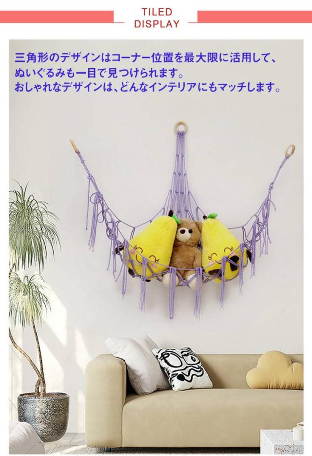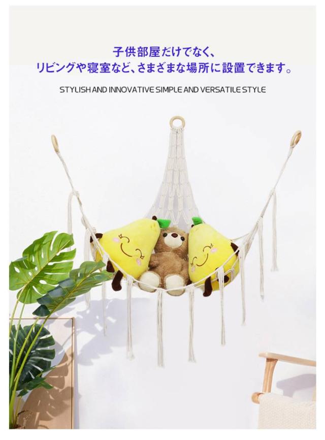 | お子様の大切なぬいぐるみをしっかりと収納できるハンモック 三角形のデザインはコーナー位置を最大限に活用して、ぬいぐるみも一目で見つけられます。 おしゃれなデザインは、どんなインテリアにもマッチします。 タッセルをつけると、よりインテリア感の強い、おしゃれな印象に。 子供部屋だけでなく、リビングや寝室など、さまざまな場所に設置できます。 | |