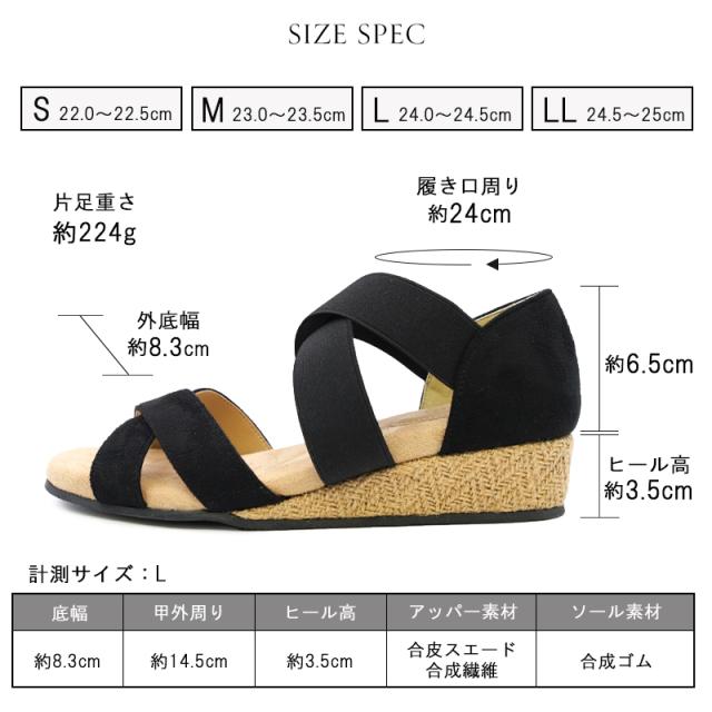 ヒール高:約3.5cm / 底幅:約8.3cm / 甲外周り:約14.5cm / 素材:合皮スエード・合成繊維/ 片足重さ:約224g