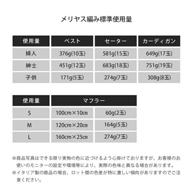 | 標準使用量 | レディースベスト 約10玉 レディースセーター 約15玉 |