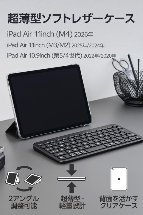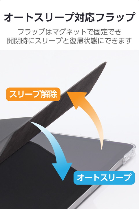 極限まで薄さにこだわった超薄型・軽量設計。シーンに合わせて2アングルにできる11インチiPad Air(M4)、11インチiPad Air(M3)、11インチiPad Air(M2)、iPad Air (第5世代 2022年モデル)、iPad Air (第4世代 2020年モデル)用フラップケースです。機器本体の背面デザインを活かせるクリアケースを採用しています。![]() ■極限まで薄さにこだわった超薄型・軽量設計の11インチiPad Air(M4)、11インチiPad Air(M3)、11インチiPad Air(M2)、iPad Air (第5世代 2022年モデル)、iPad Air (第4世代 2020年モデル)用フラップケースです。 ■傷に強いポリカーボネートを使用し、本体の背面デザインを活かせるクリアケースを採用しています。 ■傷や汚れが付きにくく、高級感のあるソフトレザー素材を使用しています。 ■動画視聴やタイピングなどのシーンに合わせて2つのスタンド角度を選べます。 ■不使用時に画面部分を保護するフラップが付いています。フラップを閉じるとスリープモードになり、開けるとスリープから復帰します。 ■フラップはマグネットで簡単に留めることができます。 ■ケースを装着したままApple Pencil Pro、Apple Pencil (第2世代)の充電が可能です。 ■フラップ内側には本体を傷つけにくい起毛素材を採用しています。 ■本体装着部の縁が液晶画面を覆わず、見やすく操作しやすい設計です。 ■ケースを装着したままで画面の確認、充電、各種ボタン操作が可能です。 ■ケースを装着したままで写真撮影が可能です。 ■※開封後スタンドとして初めて使用する際は、フラップの溝に沿ってしっかり折り曲げてからご使用ください。材質の特性上、タブレットを立てにくい場合があります。 ■自社環境認定基準を1つ以上満たし、『THINK ECOLOGY』マークを表示した製品です。 ■廃棄物削減に取り組み、製品に同梱する取扱説明書等をペーパーレス化した製品です。 ![]() ■対応機種:11インチiPad Air(M4)/11インチiPad Air(M3)/11インチiPad Air(M2)/iPad Air (第5世代 2022年モデル)/iPad Air (第4世代 2020年モデル) ■セット内容:ケース×1 ■材質:フラップ部表面:合成皮革、裏地:ポリエステル、本体装着部:ポリカーボネート ■カラー:ブラック ■サイズ:幅約182mm×厚さ約11mm×高さ約252mm |