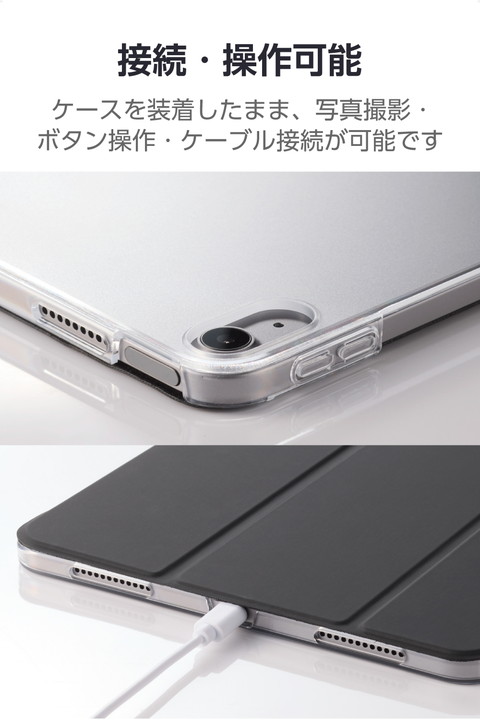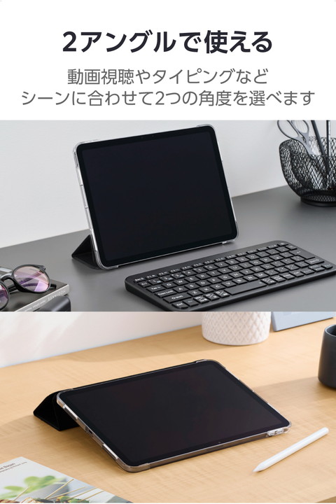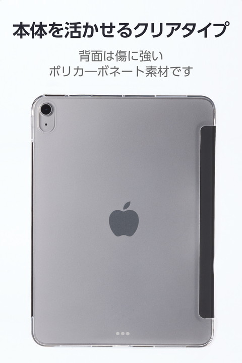 極限まで薄さにこだわった超薄型・軽量設計。シーンに合わせて2アングルにできる11インチiPad Air(M4)、11インチiPad Air(M3)、11インチiPad Air(M2)、iPad Air (第5世代 2022年モデル)、iPad Air (第4世代 2020年モデル)用フラップケースです。機器本体の背面デザインを活かせるクリアケースを採用しています。