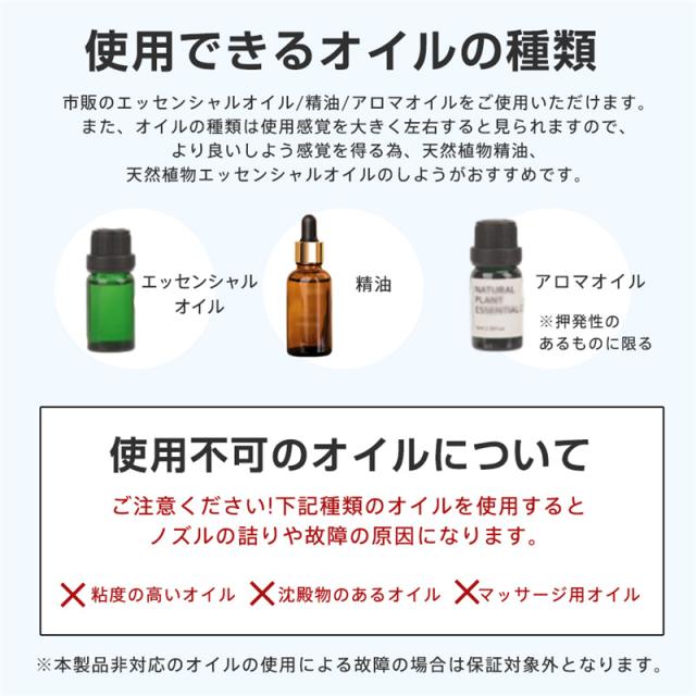 従来の超音波式のように水を混ぜる必要なく、天然オイルを100%直接ミスト化して噴射するから瞬時に香りが広がります。水なし仕様なので、カビや雑菌が繁殖する心配が少ないです。