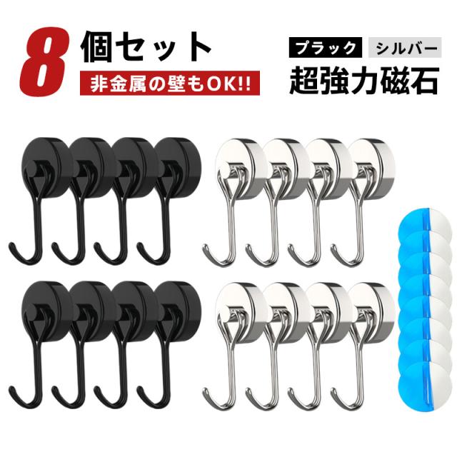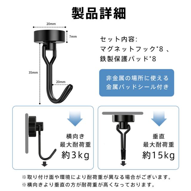 マグネットフック 超強力 マグネット 金属製保護パッド付き 8個セット 磁石 ステンレス製 防錆 垂直向き最大耐荷重15kg キッ