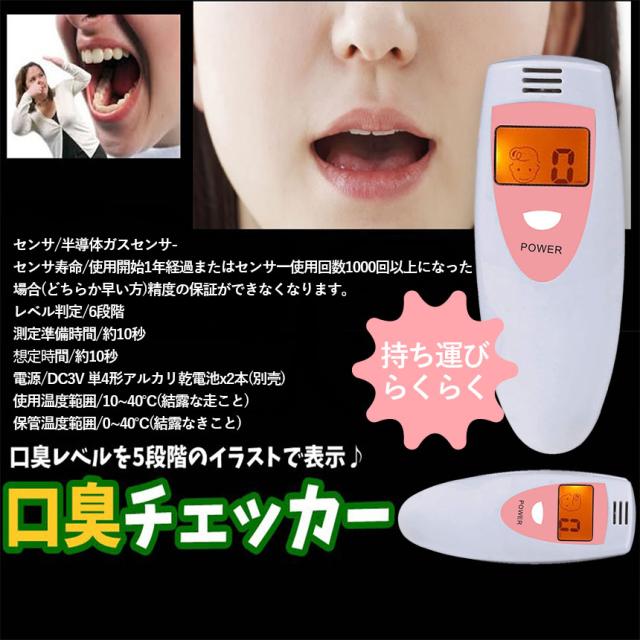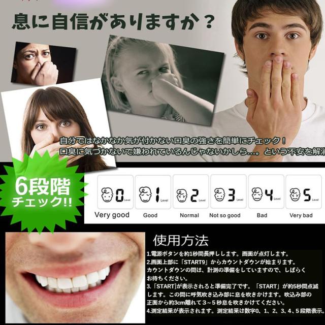【商品説明】口臭レベルを6段階のイラストで表示♪「口臭チェッカー」の登場です!!! 携帯に便利なポケットサイズです。気になるあなたの口臭レベルは? "息に自信がありますか?自分ではなかなか気が付かない口臭の強さを簡単にチェック!口臭に気づかないで嫌われているんじゃないかしら...。という不安を解消" 息を均等に3秒以上吹くことで、簡単に6段階レベルのチェック結果がでます。