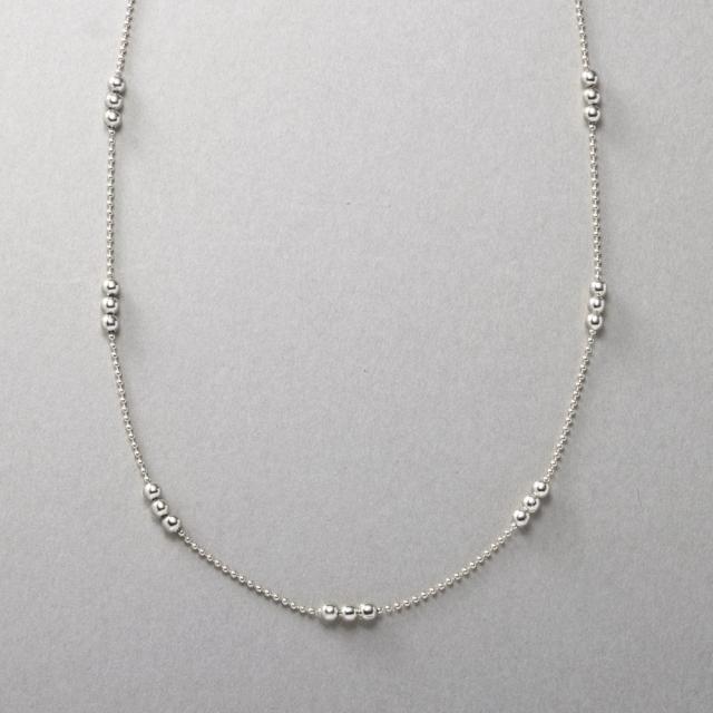 3連のメタルボールを等間隔に配したステーションチェーンのロングネックレス。小ぶりなメタルボールの艶めきがスタイリングの程よいアクセントに◎カジュアルにもキレイめにも合わせやすいオススメのアイテムです。