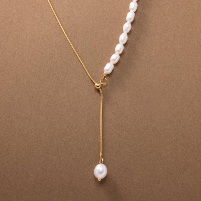 しなやかなスネークチェーンと淡水パールを合わせたステンレス製ラリエットネックレス。中央のスライドパーツでY字のサイズ感を細かく調節できるから、色々なスタイルでおしゃれを楽しめちゃいます◎錆びにくいステンレス製でデイリーに活躍しそう。