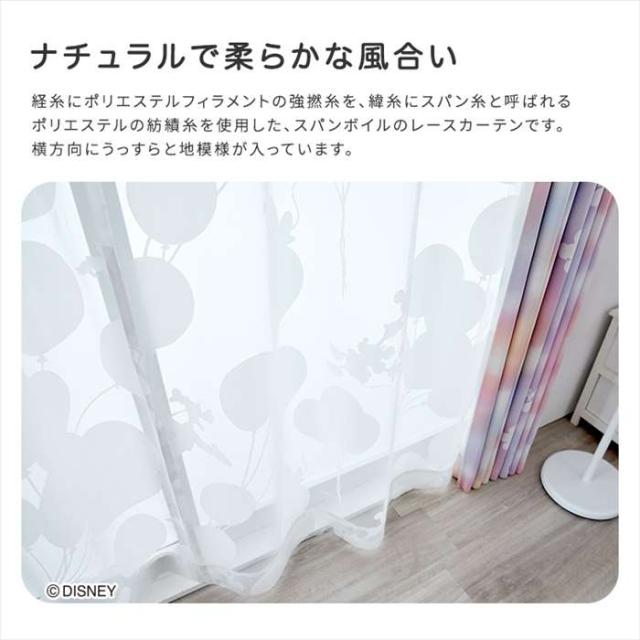 風船で遊ぶミッキーたちがリズミカルなレースカーテン。シンプルなデザインなのでどんな部屋にもなじみやすいです。洗濯することができ、しわになりにくい仕様になっているのでお手入れも簡単です。