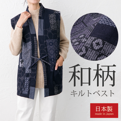 日本製 和柄キルトベスト ネイビー チョッキ ちゃんちゃんこ 袖無し綿入れ半纏 ベスト 紺色 レディース 婦人服 ミセス シニア 女性 部屋着 羽織り 和風 キルティング 藍色 防寒 暖かい あったか 長め丈 袢纏 はんてん シニアファッション 40代 50代 60代 70代 80代 母の日 お母さん おばあちゃん 秋冬
