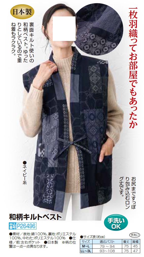 裏面キルト使いの和柄ベスト。ゆったりとしているので重ね着もラクラク。
